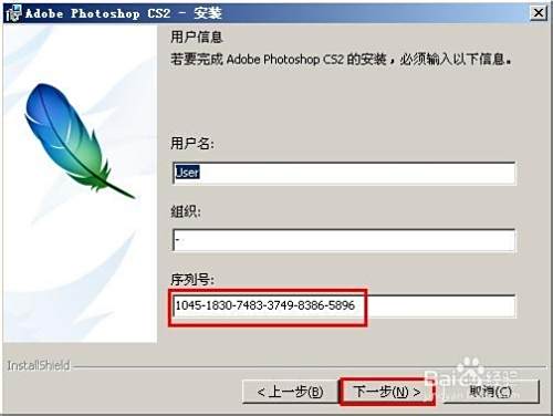 下面弹出安装信息框,我们记得一定要输入安装序列号为:1045-1830-7483-3749-8386-5896进行安装;