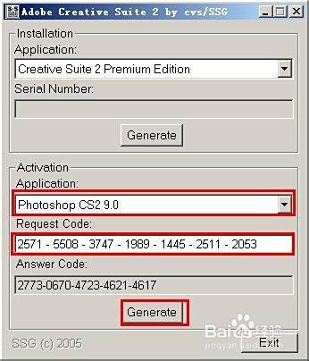 我们运行注册机,会看到有上下连个输入框好选项,我们不管上边,之际把下面的选项卡选择PhotoshopCS2 9.0,然后在Request框中输入我们安装的时候输入的那个机器码;这时候我们点击generate按钮,就可以看到已经生成了一列数字,这个就是我们需要的激活码;