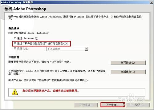 进入激活Adobe Photoshop选项,我们选择通过软件激活系统进行自动激活选项,然后点击下面的下一步按钮;