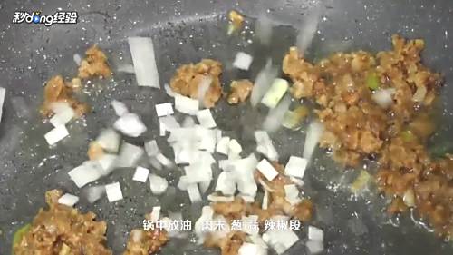 2入锅炒制:锅中放油、肉末、葱、蒜、辣椒段。