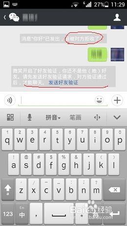 如果你愿意给对方发消息,也可以验证是否被拉黑或删除了,如图,看到上面一条微信提示对方拒收,这说明对方把你拉黑了,下面一条提示不是好友需要验证,这说明对方把你删除了