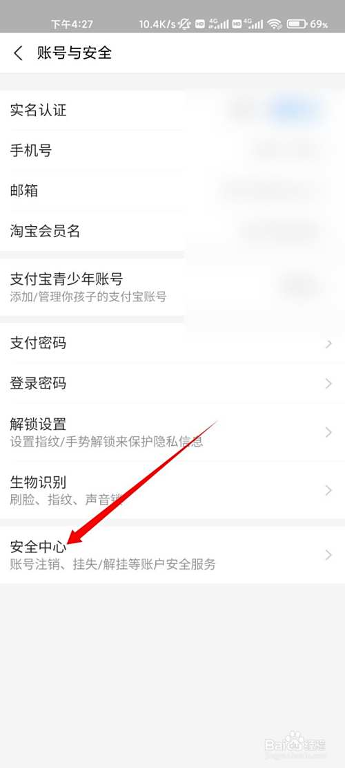 在底部,点击安全中心的选项。