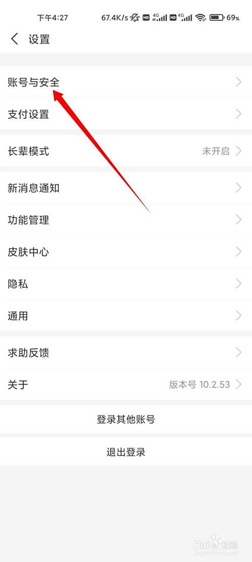 来到设置页面,点击账号与安全的选项。