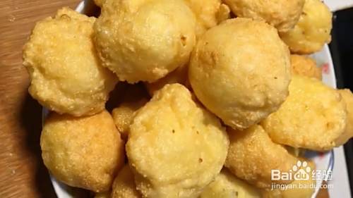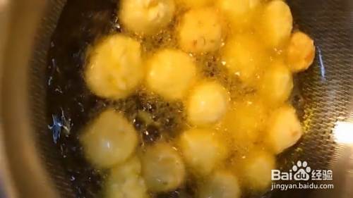 锅内放油,油温烧至五成热时,将攥好的豆腐丸子放于锅内炸制,炸制丸子浮于油面且表面金黄时,用漏勺捞出。