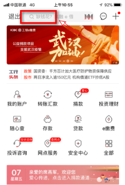 第一步,我们需要在手机上下载中国工商银行App,打开并登陆自己的账号,如下图所示点击搜索框。