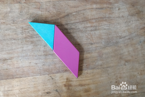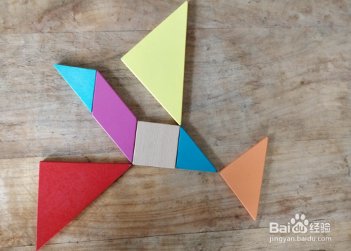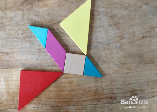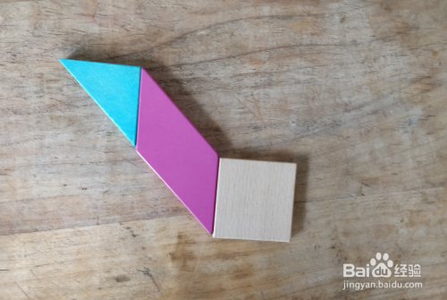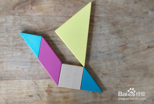摆上中号三角形,放在右侧小三角形的右侧挨着,直角向左,如图。一只飞鸟就完成了。