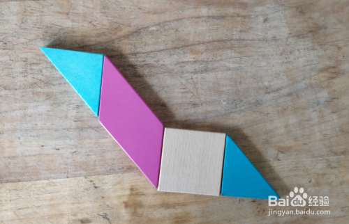 摆上余下的小三角形,放在正方形的右侧挨着,直角在左侧下端,如图。