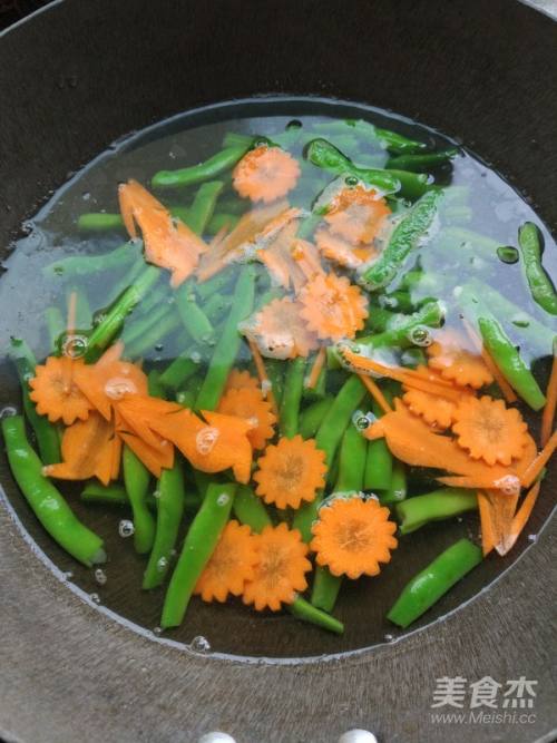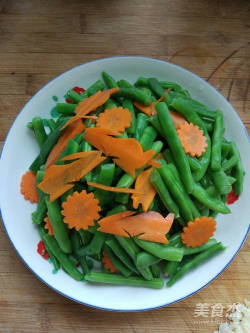 4四季豆入开水锅中焯一分钟,出锅时入胡萝卜片烫一下,捞出过凉控干。