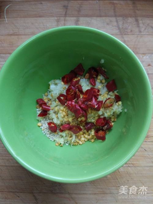 6取小碗一个,芝麻放底部,蒜末,姜末放上面,干辣椒放顶部。