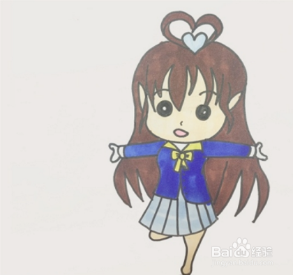 最后将上衣涂蓝,衣领涂黄,裙子与爱心发饰涂上浅蓝色