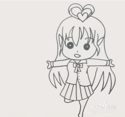 然后往下画出下身穿着的百褶裙与双腿后,将披着的长发也补充画出来。