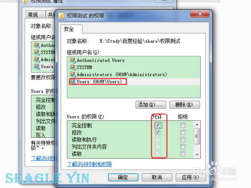 在窗口上半部分的 组或用户名 中选择要编辑权限的用户,在下半部分 权限 中列出了当前组或用户的权限,勾选或者取消勾选即可设置相应的权限。