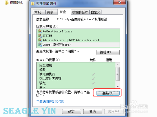 当然了,如果您觉得上述设置还不能满足您的需求的话。可以在文件夹属性的 安全 选项卡下点击 高级。如下图所示。
