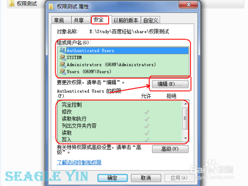 在上面的 安全 选项卡中点击 编辑 按钮,弹出如下窗口。