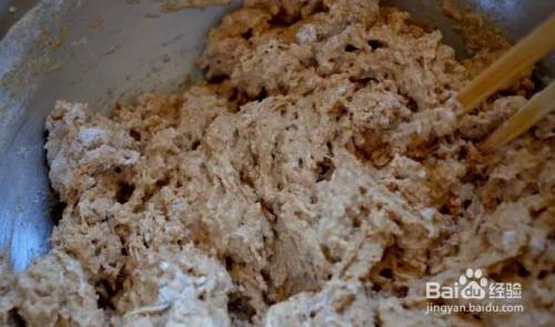 将糖蜜酵母粉水慢慢倒入面粉中,边倒水边用筷子搅拌面粉,一直到图片中的这个样子。