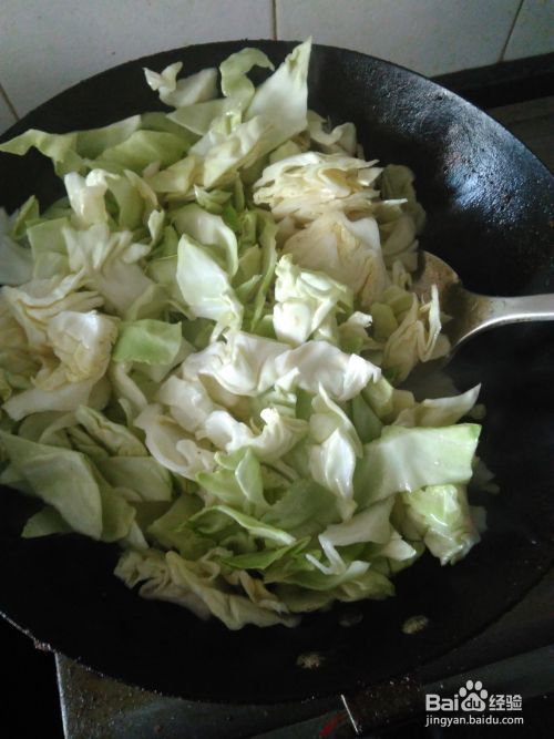 锅内倒入适量植物油,放入葱花,放入准备好的圆白菜翻炒。