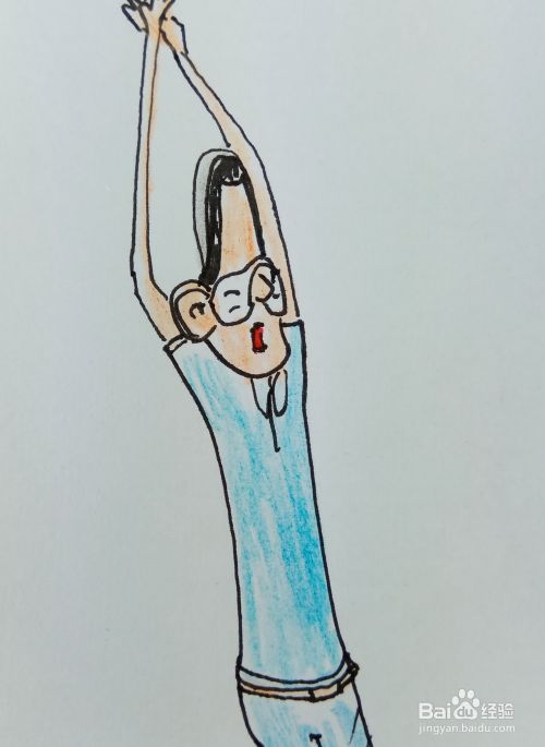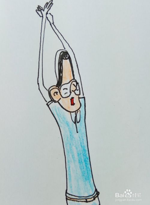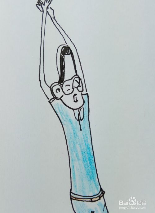 用蜡笔涂出他身上穿着的裤子和衣服的色彩。