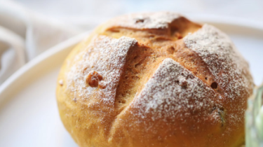 南瓜提前蒸熟取用70克,加入白糖、水和酵母溶解后,加入高粉、全麦粉和盐揉成光滑面团后加入室温软化的黄油