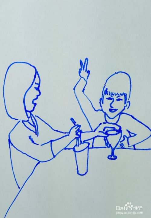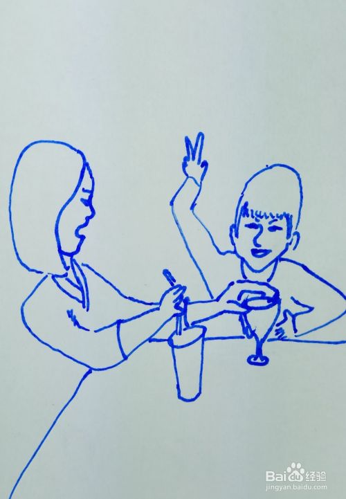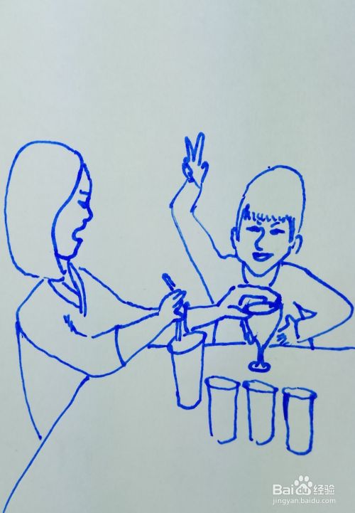 用线条画出她们的身体部分,画出桌上放着的其它杯子。