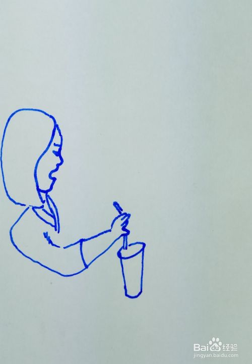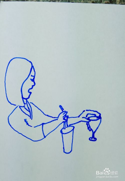 在白纸上用线条和曲线画出一个女人的头部轮廓,并画出她的五官和头发,然后再画出她的右边胳膊和她手边的一杯饮料。