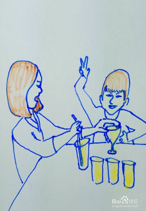 涂出他们的头发色彩和杯子色彩,修饰一下细节,简笔画就画好了。