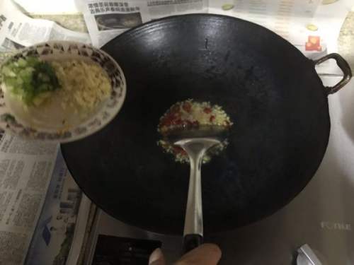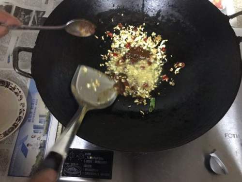 锅内放油烧热,将生姜干辣椒炒香,放蒜末、葱、花椒爆香。