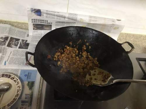 放入肉末炒匀,放一品鲜酱油、盐炒匀。