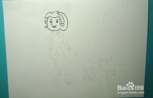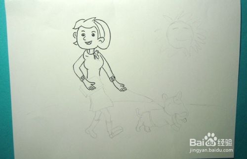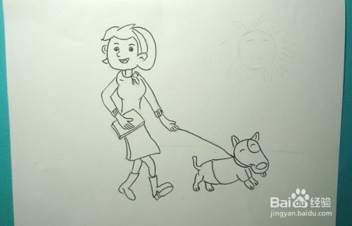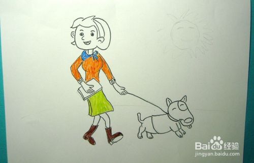 简笔画可以直接用彩色笔绘画,可先用铅笔在白纸上画出草图,接着用不同的彩色笔绘制出线条,根据不同的图形采用不同的颜色,但要注意色彩的搭配和谐。这里给大家分享彩色简笔画,牵小狗晒太阳的女孩,大家也来画画吧。