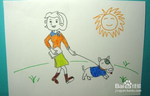 最后,用蓝色彩色笔给小狗的衣服涂上颜色,并用橙色彩色笔画出太阳,用绿色彩色笔画出绿色的草地,这样牵小狗晒太阳的女孩的彩色简笔画就画好了,如下图所示。