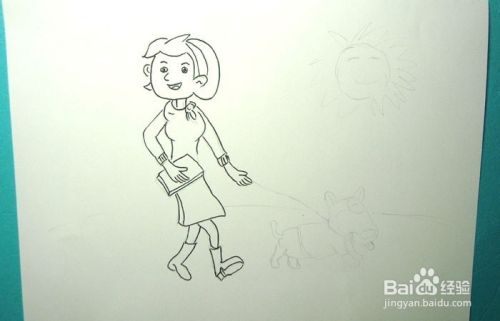然后,用黑色彩色笔画出女孩的身体和裙子、腿脚、鞋子的图形出来,注意女孩走路的姿态要画好看些,如下图所示。