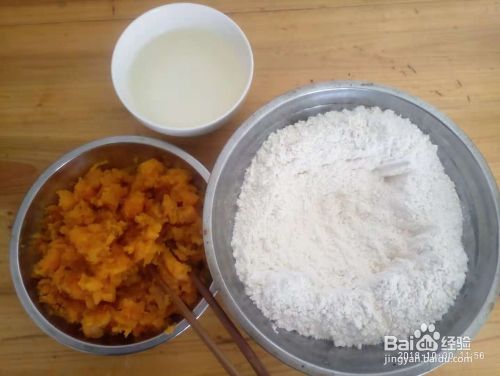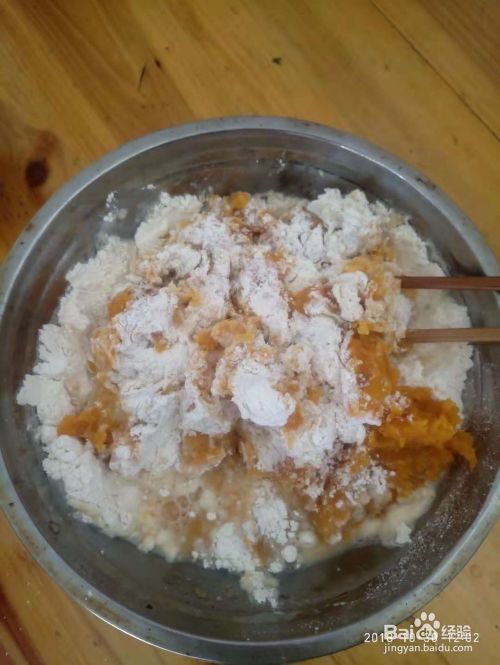 将红薯泥和活化后的酵母放盆里,添加面粉,一边添加一边搅拌,添加适当的清水揉均匀。(喜欢吃甜一点的朋友,也可以在这时候加一点糖)