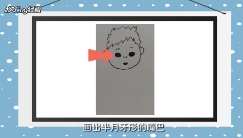 3在脸部刻画出五官,眼睛画得狭长一点,画出半月牙形的嘴巴。