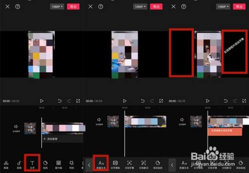 3、点击【文字】,点击【新建文本】,输入文字,将文字框拖在视频框外即可。