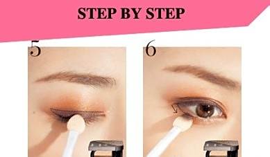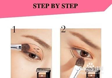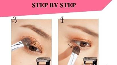 Step 1:选择浅橘色眼影扫入整个眼睑内,并由下而上由内而外渐渐刷淡;同样的颜色刷于下眼睑,由后方往前刷淡。