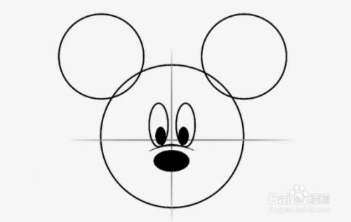 在两条直线的交点下方绘制一个水平和中央的椭圆形(鼻子),并在椭圆形上方添加一条曲线(它的长度应稍长于两侧的椭圆形)。为眼睛画两个长的垂直椭圆形,并在眼睛底部添加一个小的黑色椭圆形。