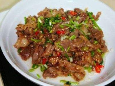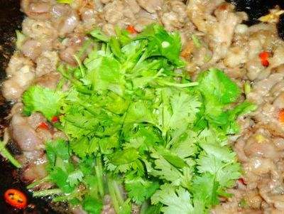 4、锅中放少许油(如果肥羊肉也可不放油)将羊肉煎至香,放调料、辣椒和香菜。