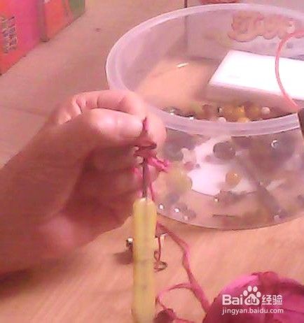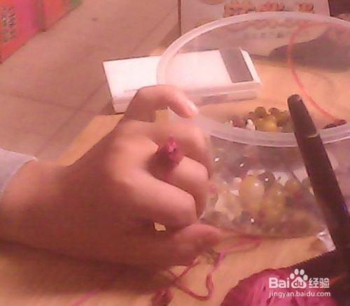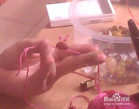 拿一个钩针,把两个花托儿串起来,把花心儿钩过去。图二:钩过来了,然后把两边捻成线,两头捥个死疙瘩儿。这个不许说不会:实在不会,搜我的:(实用的编珠手链,不会说了)在第二步里。看手指粘个胶布,代价知道不,玩的伤着手了。。。