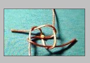 然后编这两个花托儿,编法是一样的,只是一个两层,一个三层。发现我越来越会画图了嘿嘿,从1头开始转个圈儿,线色只是步骤好看清楚,不用彩线地,然后再转个圈儿,然后从1头下面过去,压,穿,压,穿,然后拿着1头找2头去,最后从中间下去,是不是很简单。这个形状就弄好了,下面就是拿着2头沿着1头走就行了。一个两层的,一个三层的。手里两个花托儿。