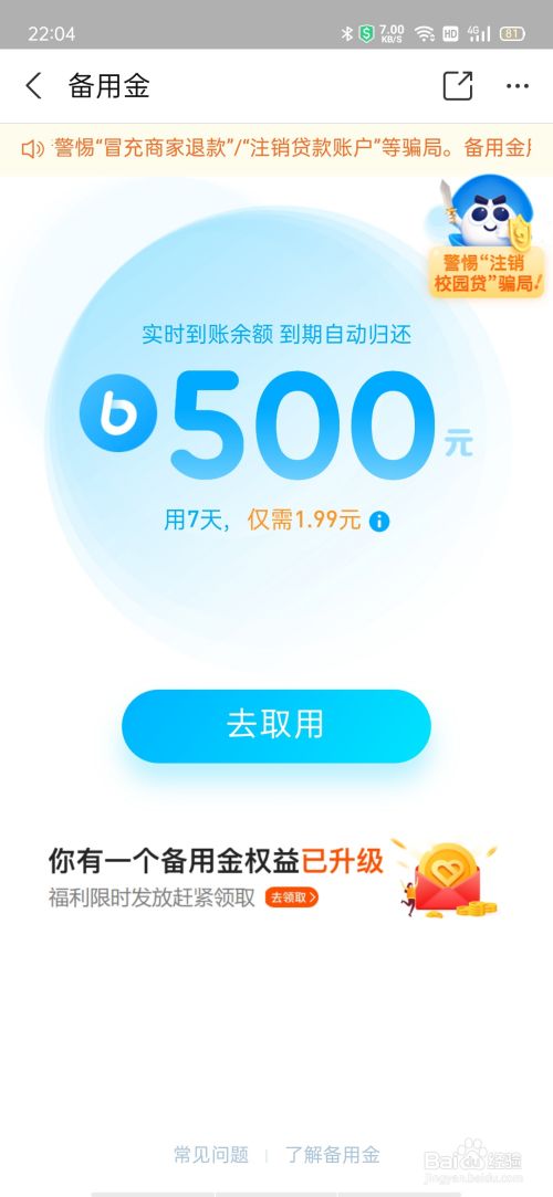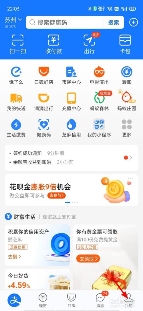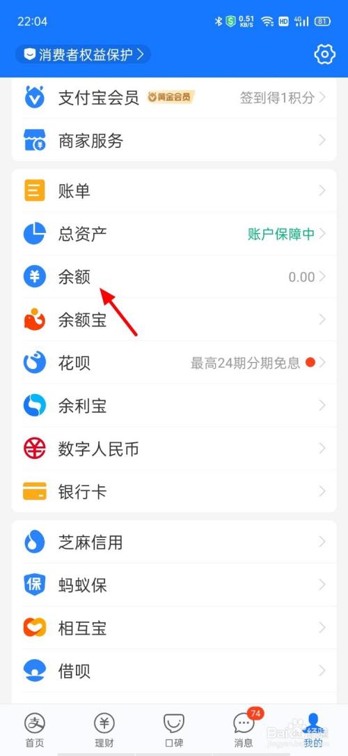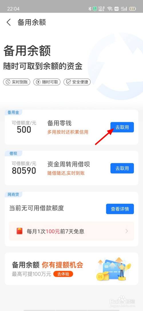 打开支付宝,在我的选项下打开余额选项。在备用选项下打开备用金选项即可查看。