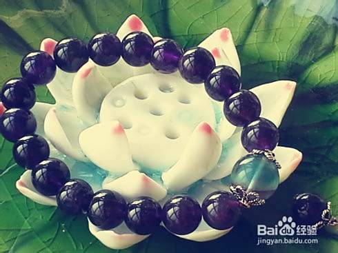 鉴于此手链石色暗沉,主人年龄较长,怀旧心理很浓,不适合用太跳脱的色彩,加了颗蓝紫色萤石和银花托做配饰,萤石的蓝点亮了紫水晶的暗色,银花托提升精致感