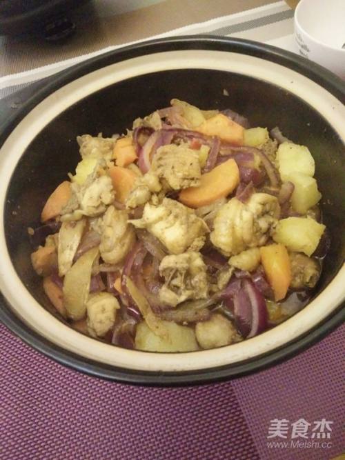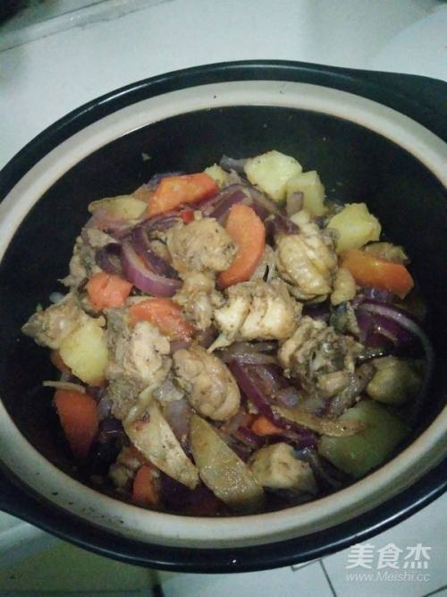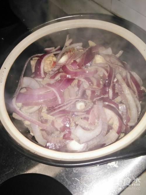 7然后倒入砂锅里,开小火,盖上盖子闷几分钟,这个时候可以炒洋葱了