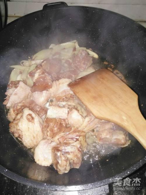 6再倒入鸡肉,翻炒几分钟,盖上盖子焖两三分钟那样。