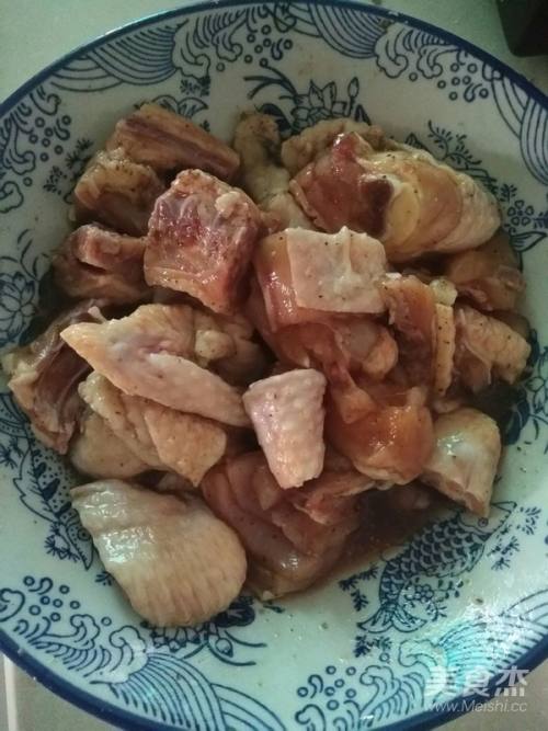 1把鸡洗干净,泡冷水半小时泡去血水,然后捞起来腌制,放料酒两勺,耗油两勺,五香粉一勺,生抽一勺,然后抓均匀,腌制一个小时。