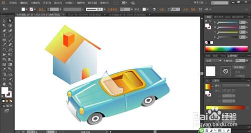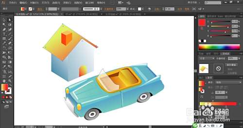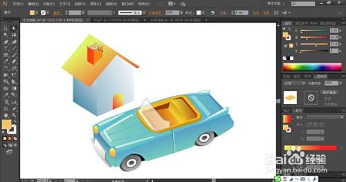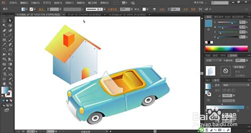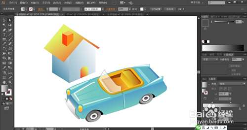 接着,我们用钢笔画出小房屋与小汽车的路径,重点绘制汽车的车灯与驾驶室的细节路径,画出挡风玻璃的路径,画出驾驶室内部的座位细节路径。