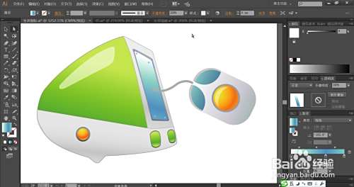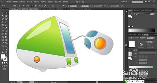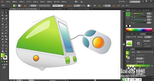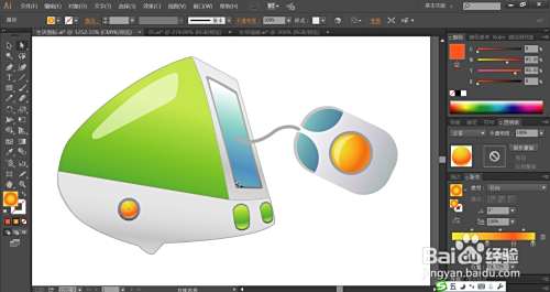 使用绿色的渐变填充电脑的左侧上方结构路径,使用灰白色填充电脑下方的结构,左侧面的按钮使用橙色的渐变色填充。