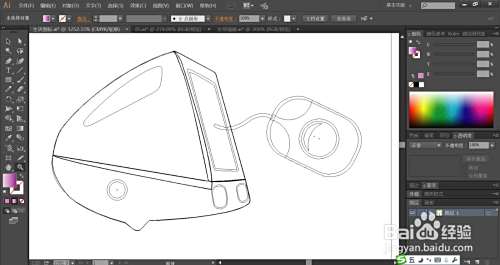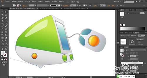 使用钢笔画出电脑的左侧面与上下结构的路径,再画出屏幕的内外边框,使用圆形工具画出电脑上面的不同位置的按钮,使用钢笔画出鼠标的细节结构。