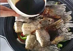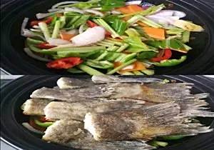 倒入所有蔬菜翻炒均匀,平铺在锅底,把煎好的鱼尾均匀铺在蔬菜上