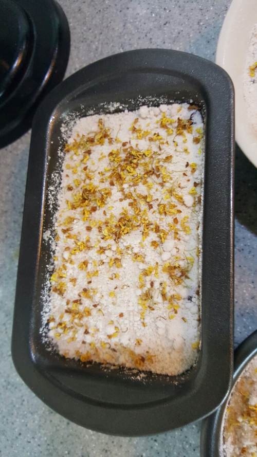 55、取陶瓷烤盘,内壁涂油,一层混合米粉,一层红豆糕粉,交替平铺,最上面一层为混合米粉,刮刀铺平,最上面洒一点干桂花。