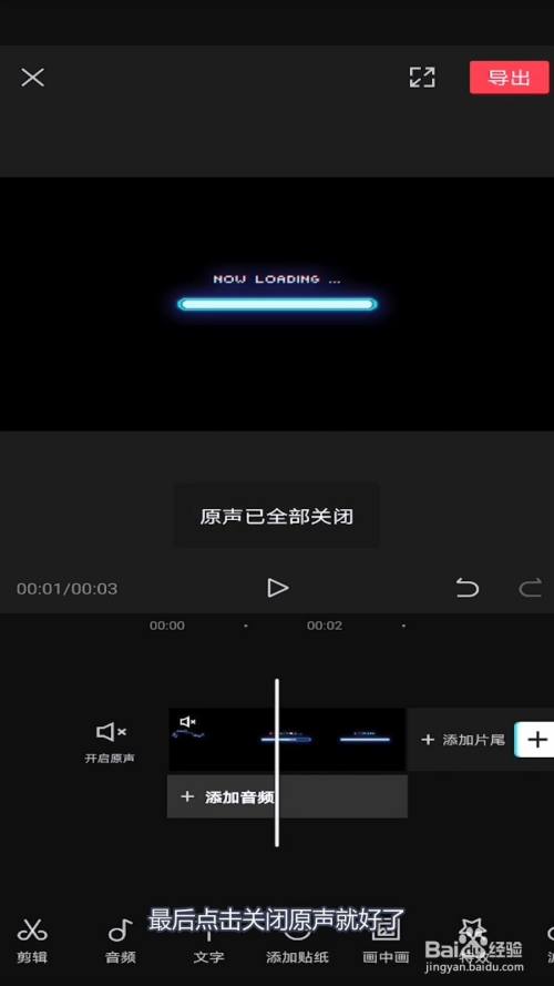 进入剪辑页面之后,在片头处我们就可以看到关闭原声了。