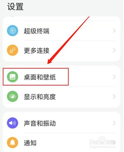 1、打开手机设置,进入设置页面里,点击【桌面和壁纸】